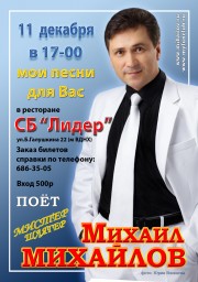 11 декабря 2010г. в ресторане 'Лидер' Предновогодняя встреча Михаила Михайлова с друзьями и поклонниками . ПРИГЛАШАЕМ НА ПРАЗДНИК ПЕСНИ И ХОРОШЕГО НАСТРОЕНИЯ!